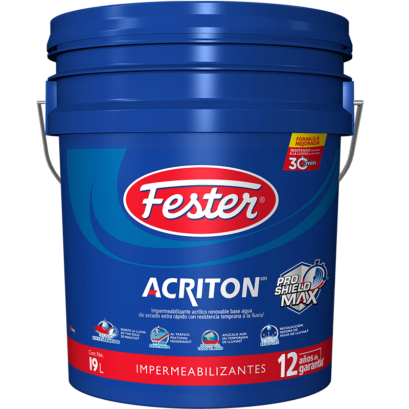 - Fester Acriton Proshield® se recomienda para impermeabilizar losas de concreto planas o inclinadas, pero también se usa sobre techumbres de lámina como: metálicas, fibro-cemento e incluso sobre acabados térmicos de poliestireno y espuma de poliuretano, previa aplicación del primer Fester Acriton® Sellador.
